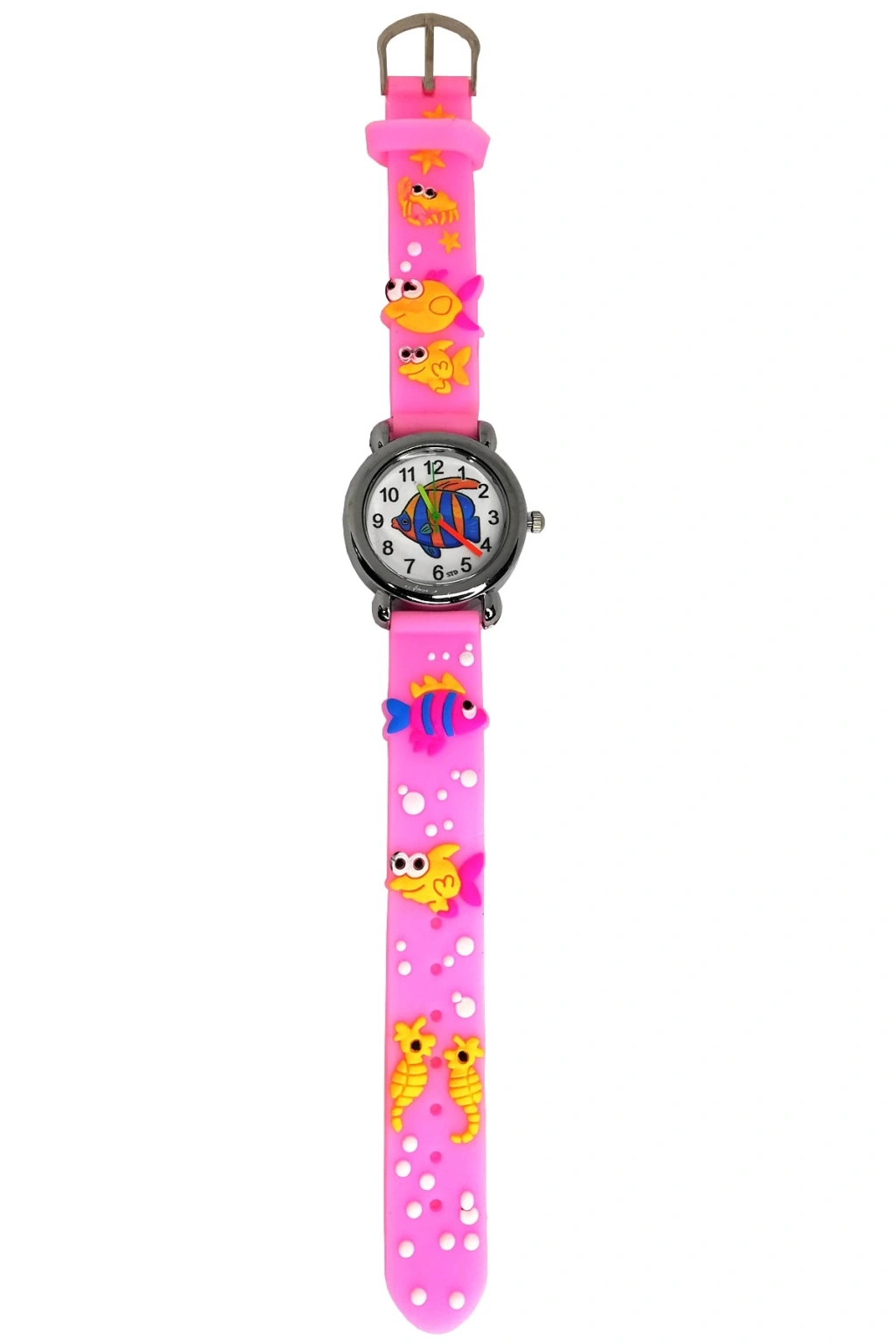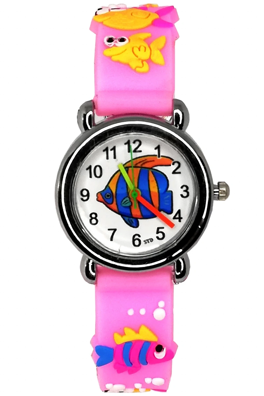 Çocukların tarzını yansıtan balık desenli tasarımıyla dikkat çeken bu kol saati, miniklerin beğenisine sunuluyor; Canlı ve eğlenceli desenleriyle çocukların ilgisini çeken bu saat, günlük kullanım için ideal bir aksesuar olarak öne çıkıyor; Çocukların yaş grubuna uygun olarak tasarlanmış olup, hem şıklığı hem de dayanıklılığı bir arada sunuyor;