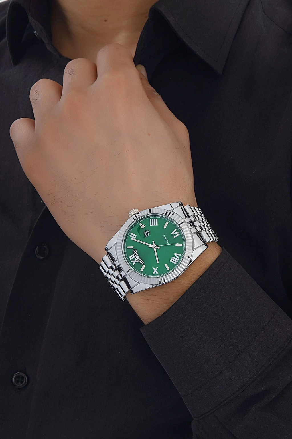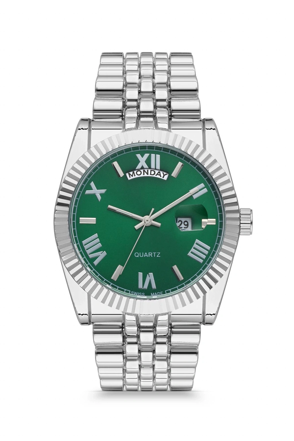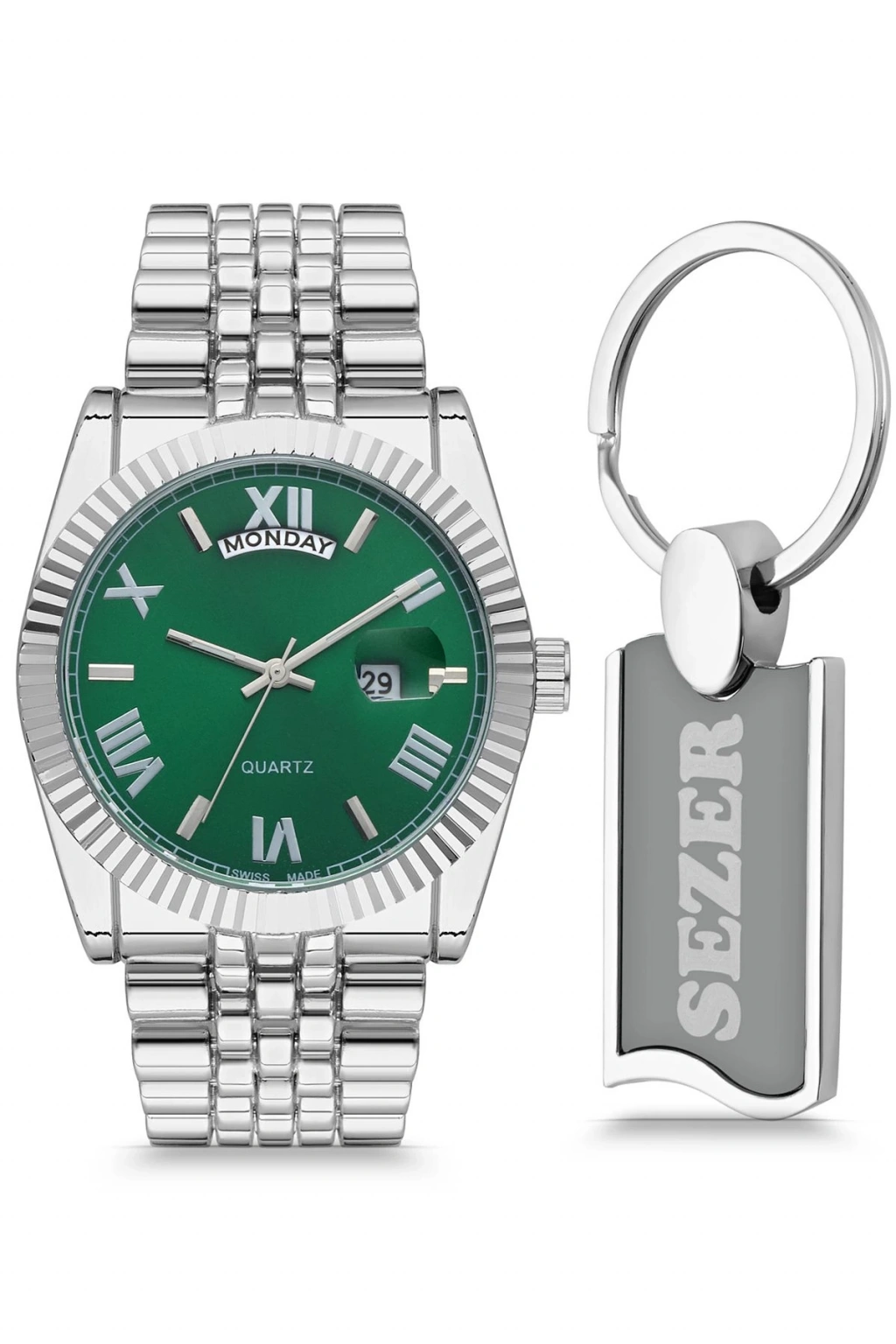 Rodium Erkek Kol Saati Metal Kişiye Özel Anahtarlıklı Gümüş - Yeşil Kadran